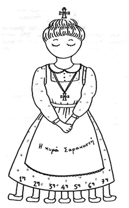 5. Σχεδιάστε 7 ίδια πόδια, όπως τα βλέπετε στο πατρόν και κολλήστε τα κάτω από τη φούστα της κυρα-Σαρακοστής. Μην ξεχάσετε να βάλετε τον κόμπο στο μαντίλι της και το σταυρό στο κεφάλι…